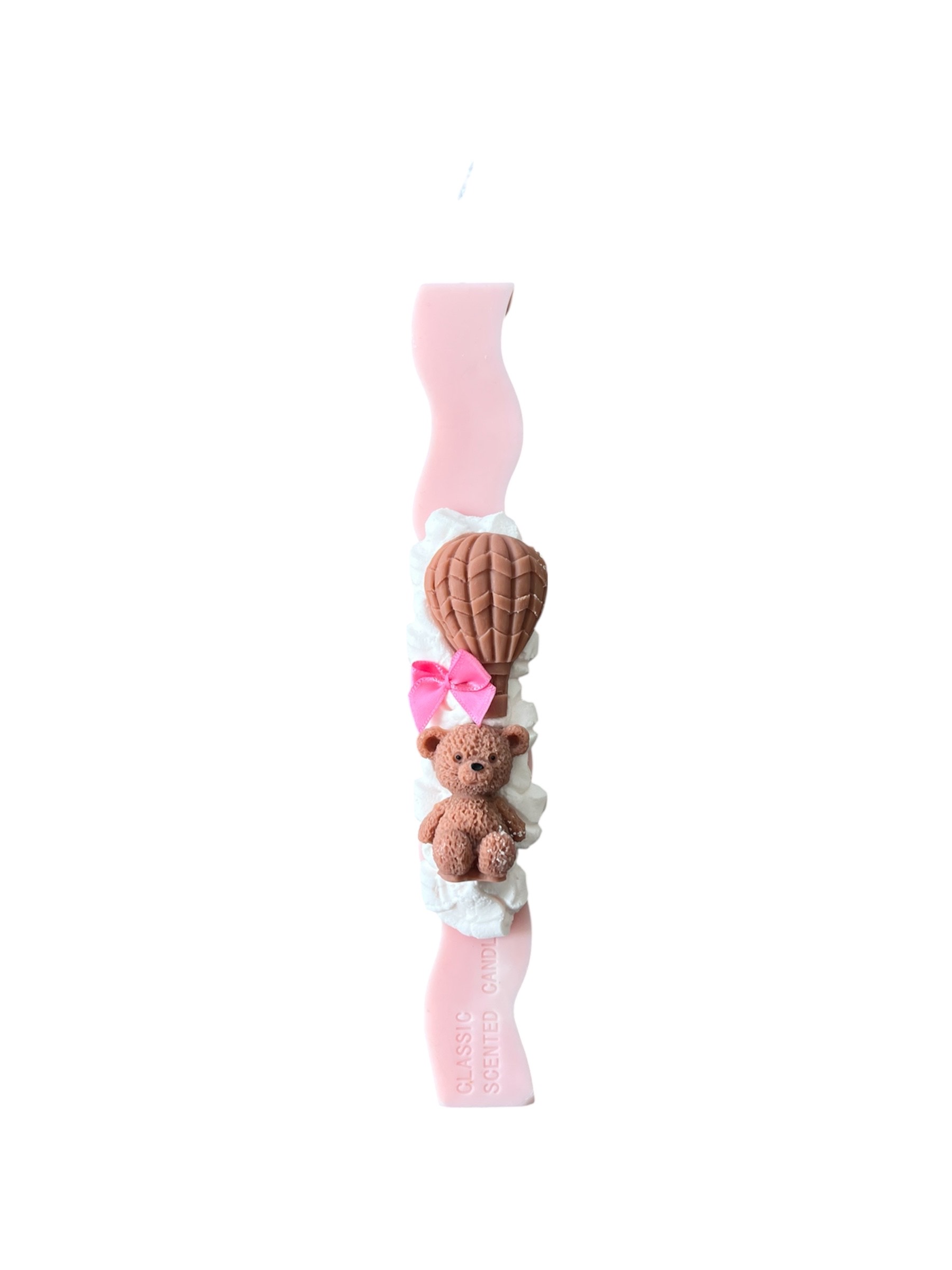 Χειροποίητη αρωματική κυματιστή λαμπάδα από φυτικό κερί σόγιας, στολισμένη με σαντιγί από κερί και ένα μικρό αρκουδάκι με αερόστατο. Διατίθεται σε ροζ, γαλάζιο και χακί χρώμα και αποτελεί μια πολύ γλυκιά και παιχνιδιάρικη επιλογή για την Ανάσταση.