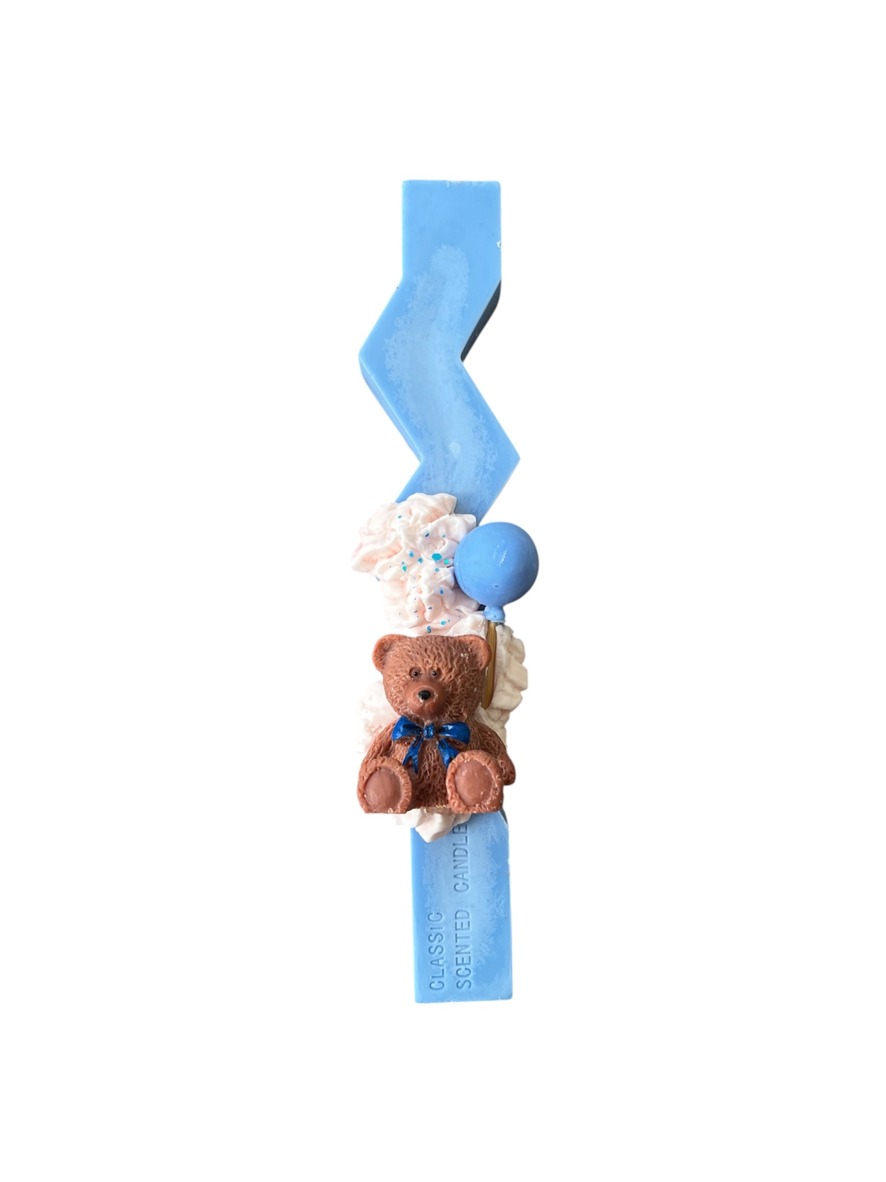 Μια γλυκιά και ξεχωριστή χειροποίητη αρωματική λαμπάδα από φυτικό κερί σόγιας, με κυματιστό σχέδιο και ιδιαίτερη διακόσμηση. Η λαμπάδα είναι στολισμένη με σαντιγί από κερί και ένα μικρό αρκουδάκι που κρατάει ένα μπαλόνι, δημιουργώντας ένα χαριτωμένο και παιχνιδιάρικο αποτέλεσμα!