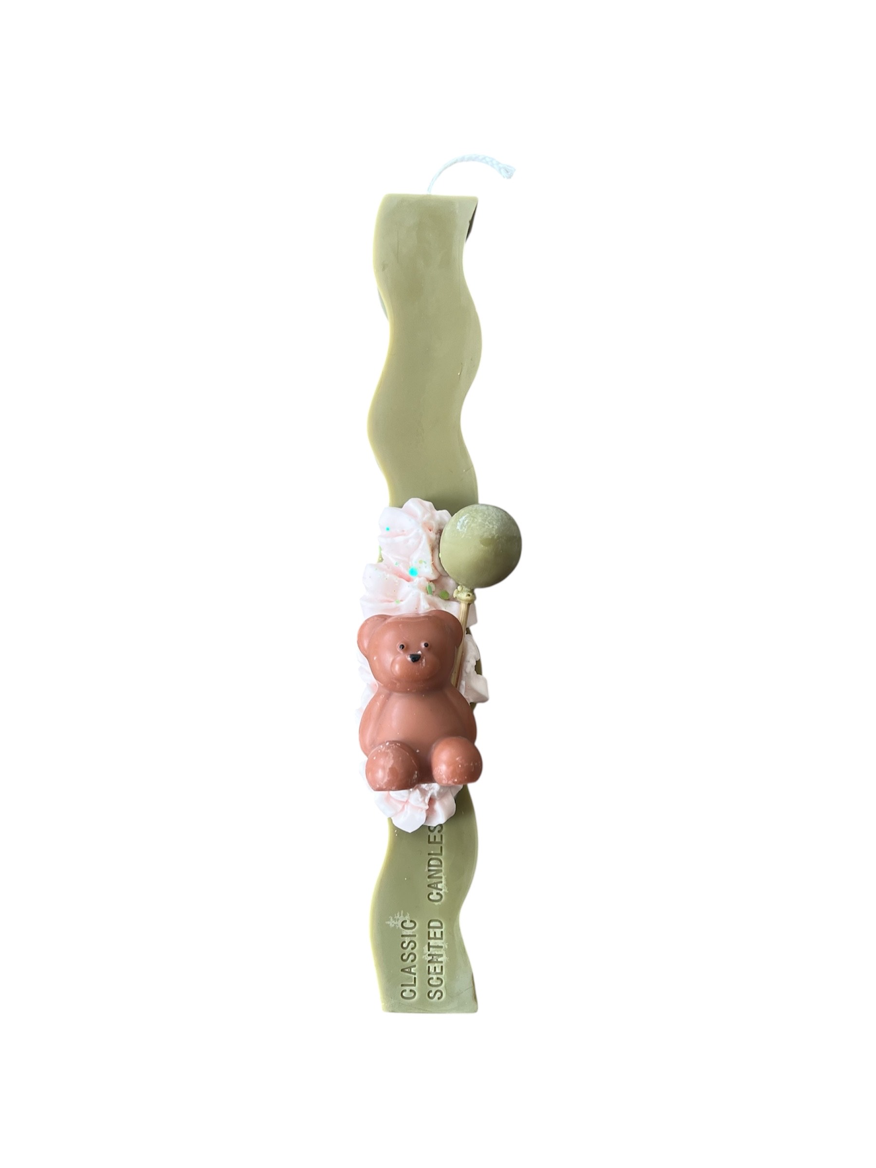 Χειροποίητη αρωματική κυματιστή λαμπάδα από φυτικό κερί σόγιας, στολισμένη με σαντιγί από κερί και ένα μικρό αρκουδάκι που κρατάει ένα μπαλόνι. Διατίθεται σε ροζ, γαλάζιο και χακί χρώμα και αποτελεί μια πολύ γλυκιά και παιχνιδιάρικη επιλογή για την Ανάσταση.
