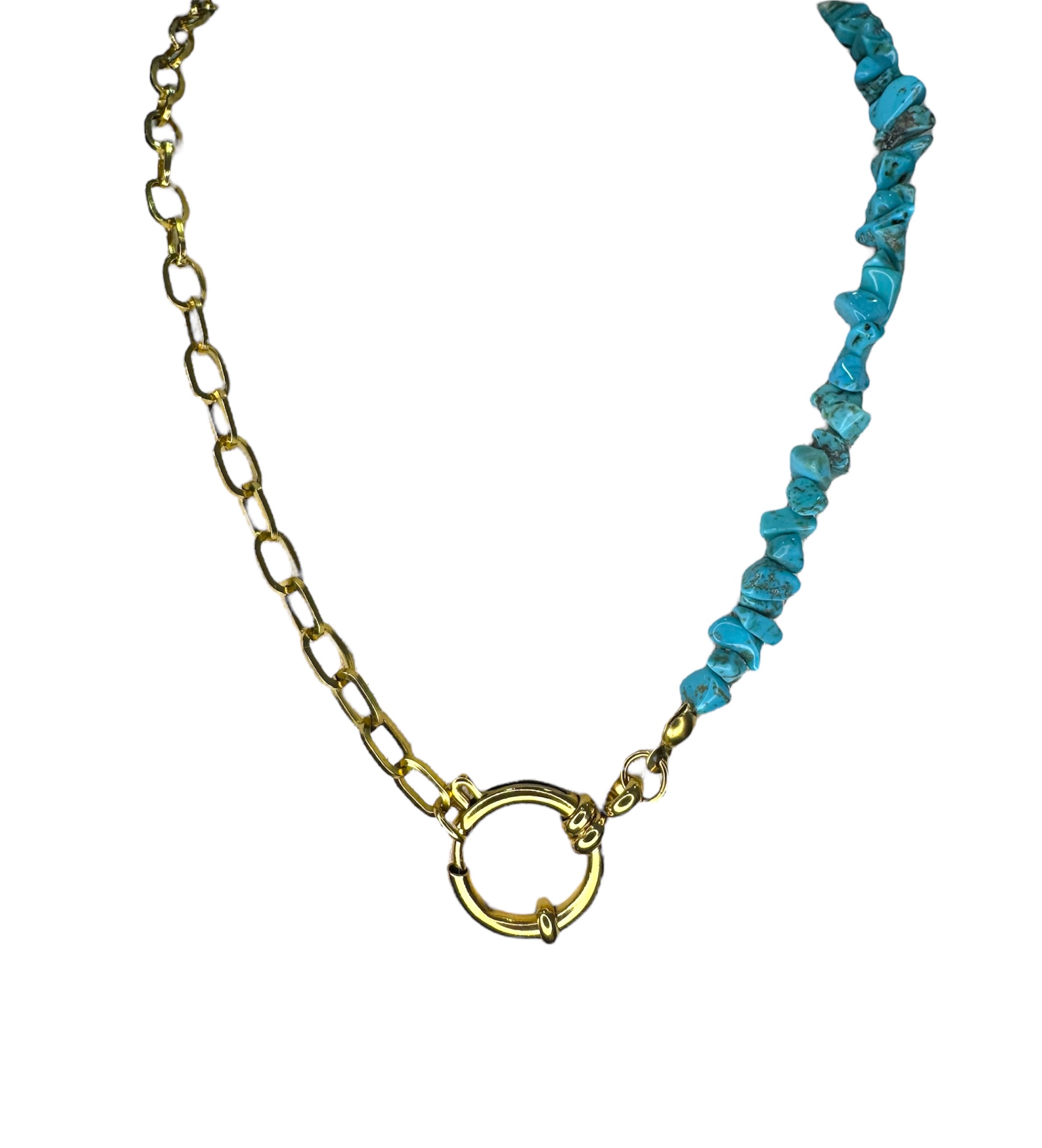 Ένα κομψό και ιδιαίτερο κολιέ με χρυσή αλυσίδα και γαλάζιες πέτρες, ολοκληρωμένο με στρογγυλό κούμπωμα στο κέντρο. Ιδανικό για elegant και ξεχωριστές εμφανίσεις.