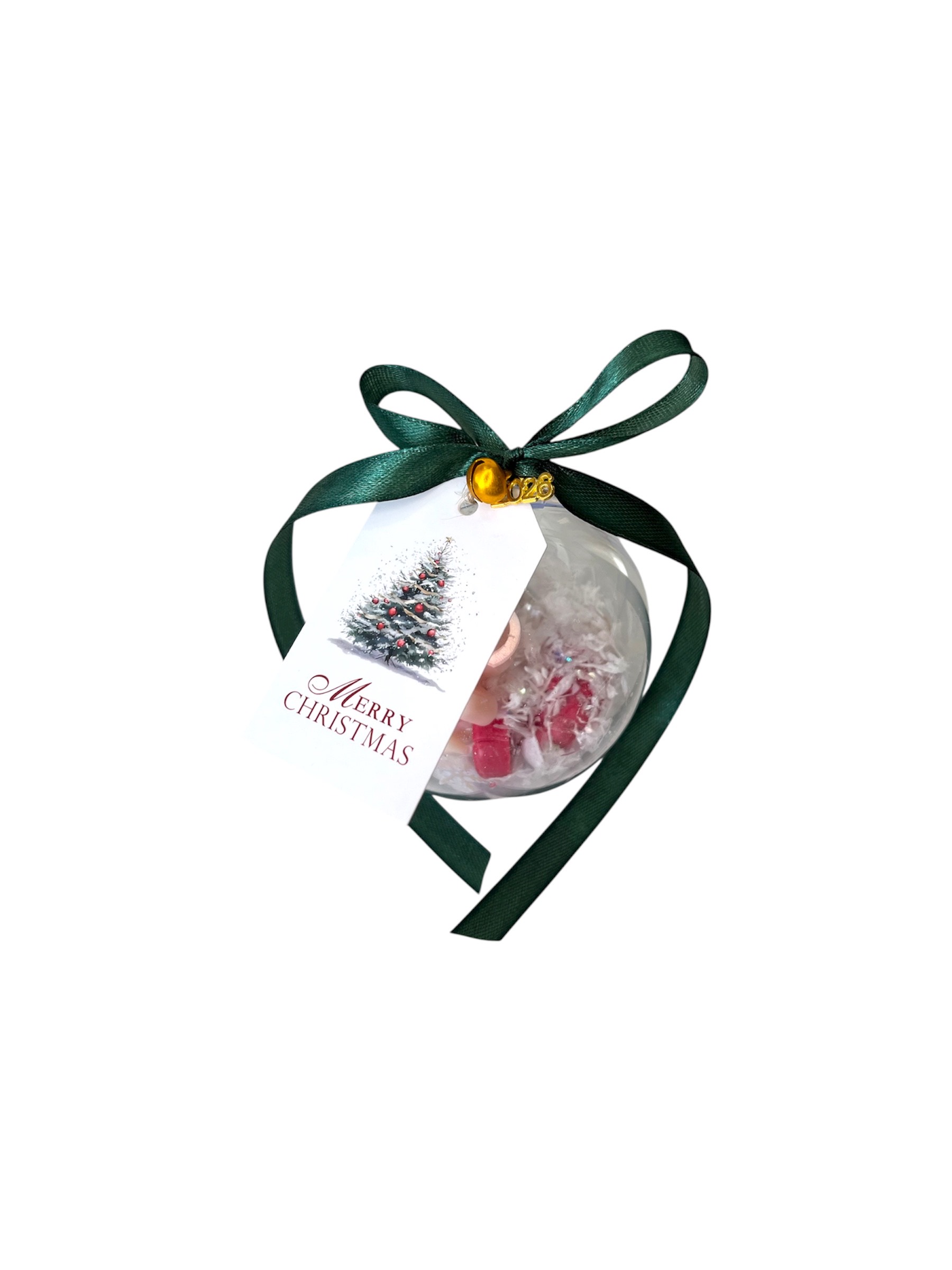 Χριστουγεννιάτικη μπάλα-δώρο γεμάτη με wax melts σε άρωμα gingerbread. Στολισμένη με κορδέλα, καμπανάκι, στοιχείο 2026 και καρτελάκι “Καλά Χριστούγεννα”.