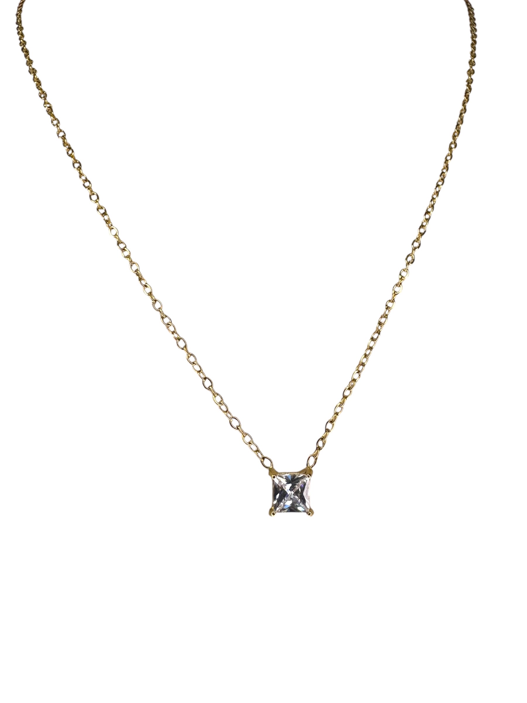 Ένα minimal και κομψό κολιέ σε χρυσό χρώμα, με ένα λαμπερό τετράγωνο στρας στο κέντρο. Ιδανικό για διακριτική λάμψη σε κάθε εμφάνιση.