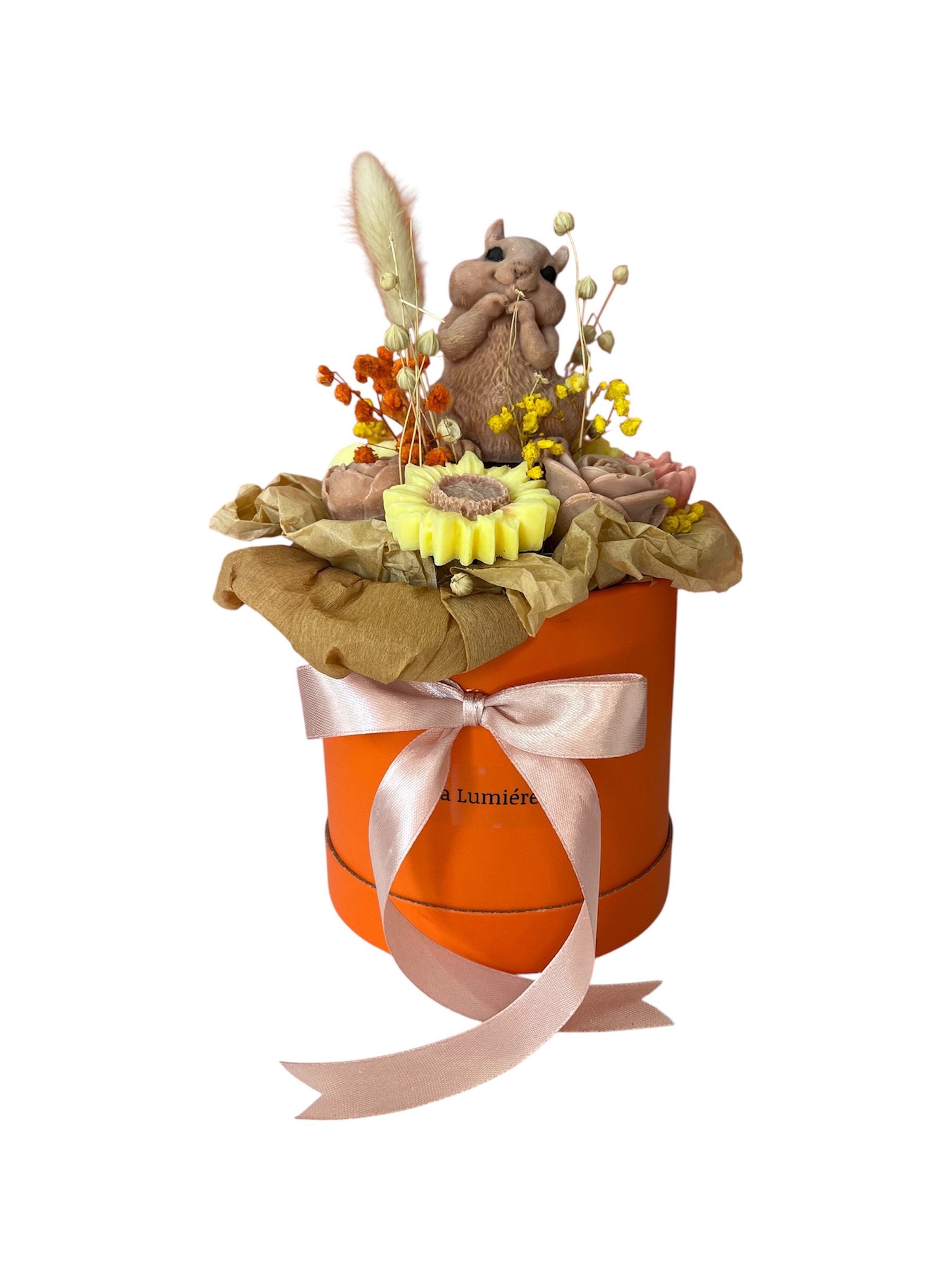 Ζεστό, παιχνιδιάρικο και απόλυτα φθινοπωρινό – αυτό το χειροποίητο αρωματικό μπουκέτο κερδίζει τις εντυπώσεις με την πρωτότυπη σύνθεσή του. Στο κέντρο του δεσπόζει ένας χαριτωμένος σκίουρος από φυτικό κερί, περιτριγυρισμένος από λουλούδια από 100% κερί σόγιας, σε αποχρώσεις του πορτοκαλί, κίτρινου και καφέ. Συμπληρώνεται από αποξηραμένα φυσικά λουλούδια και τοποθετείται σε ένα ζωντανό πορτοκαλί στρογγυλό κουτί με κορδέλα.