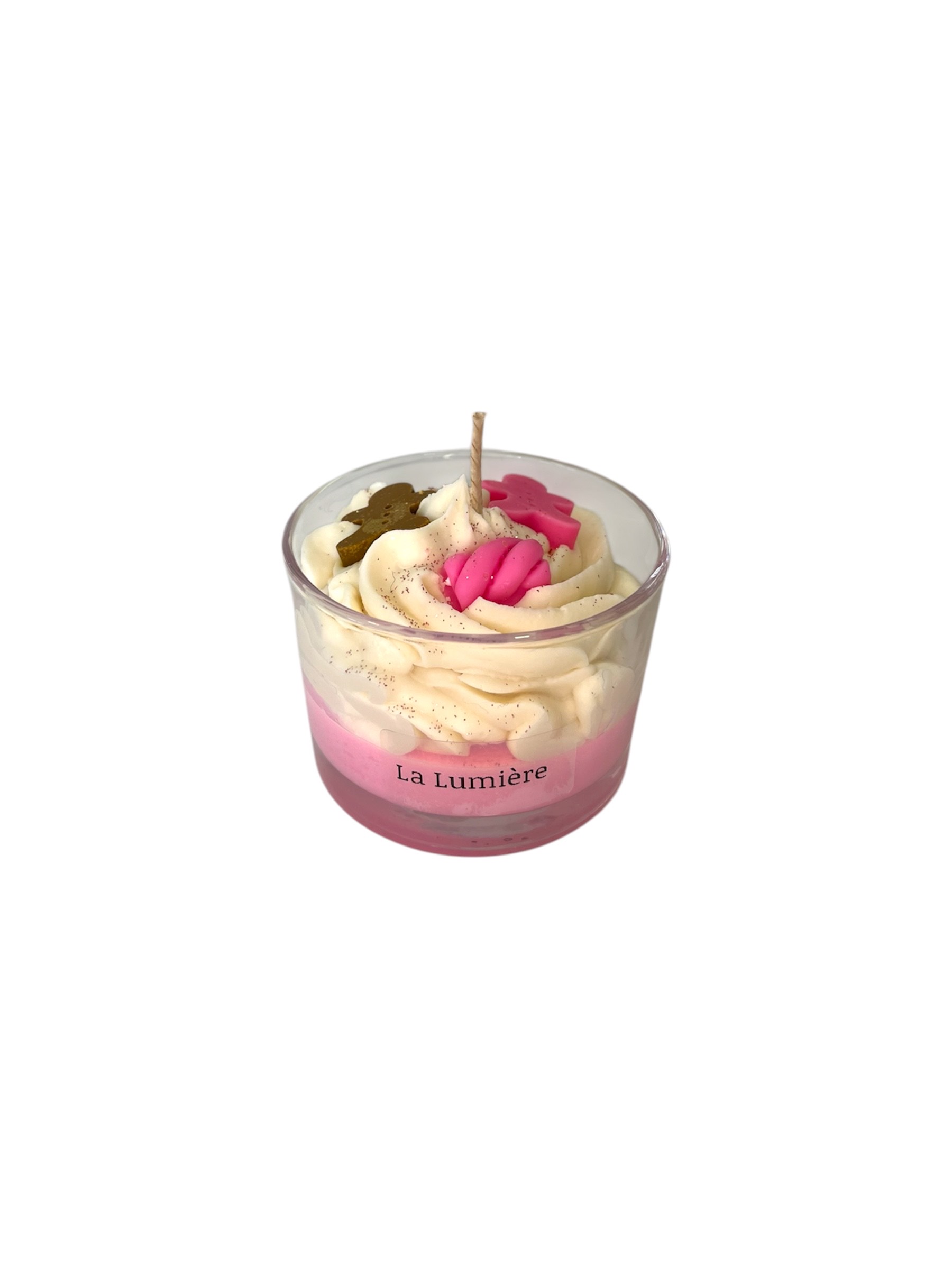 Χειροποίητο κερί σε ποτήρι με άρωμα gingerbread. Ροζ βάση, λευκή σαντιγί και διακόσμηση στην κορυφή με ροζ και καφέ gingerbread ανθρωπάκια και ζαχαρωτά.