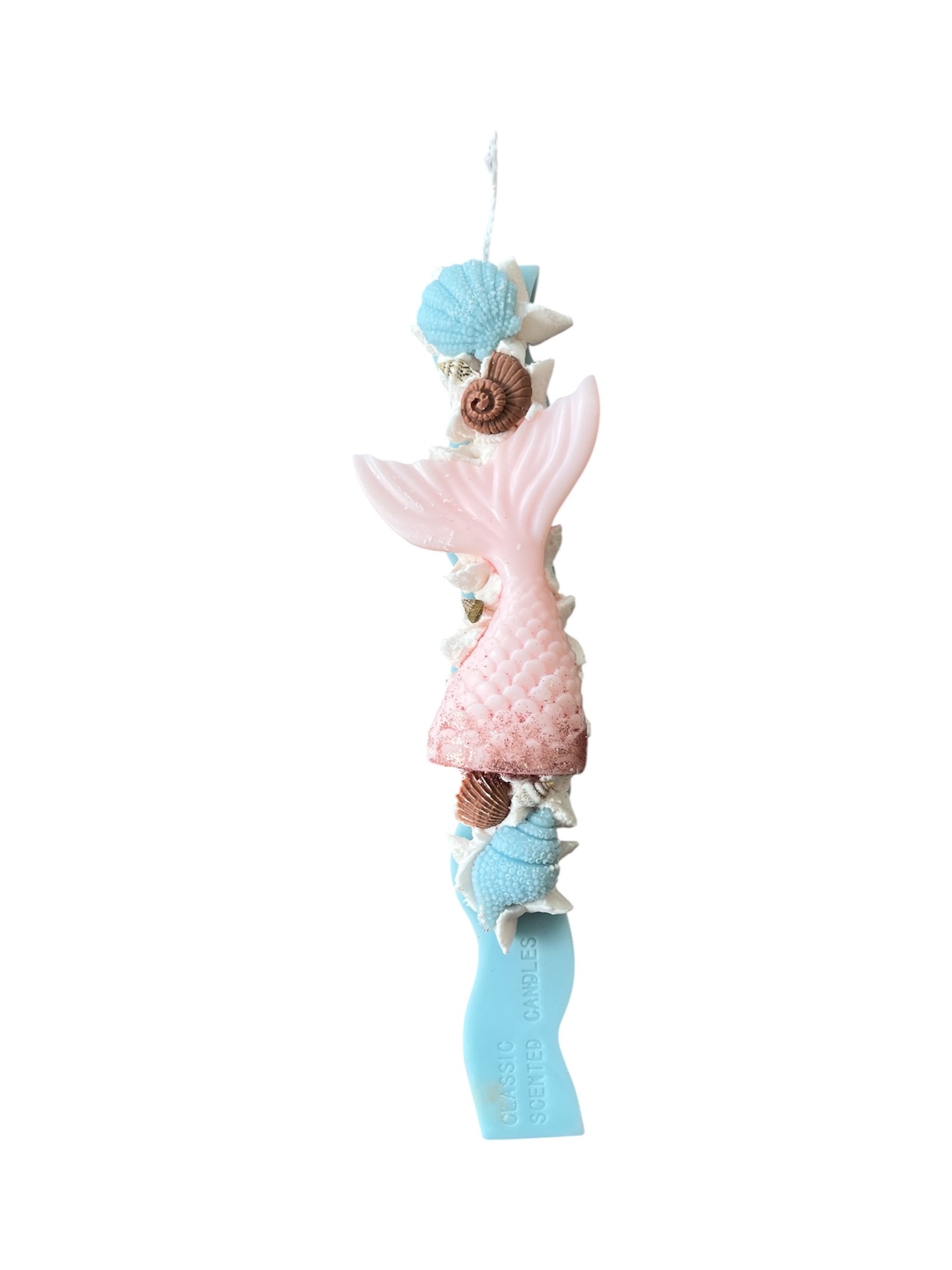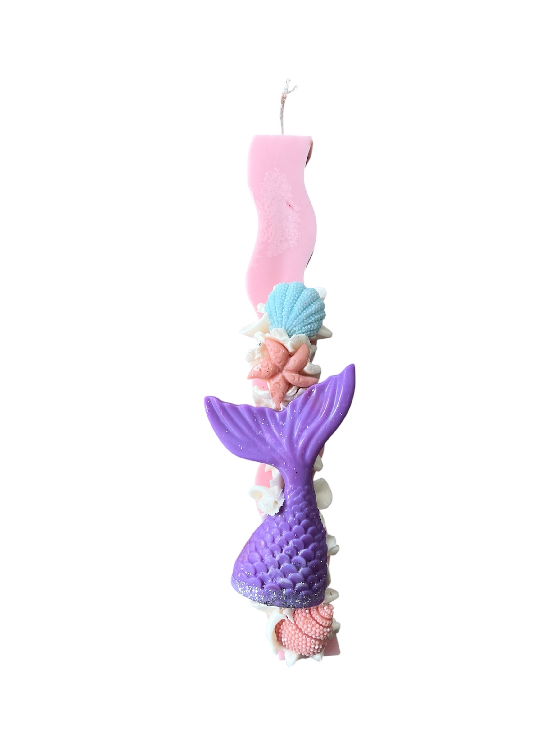 Χειροποίητη αρωματική κυματιστή λαμπάδα από φυτικό κερί σόγιας, στολισμένη με σαντιγί από κερί, μια γοργονοουρά και κοχύλια. Έχει ύψος 23 εκ. και διατίθεται σε ροζ, λιλά και γαλάζιο χρώμα. Ένα ιδιαίτερο και ονειρικό σχέδιο εμπνευσμένο από τον μαγικό κόσμο της θάλασσας.