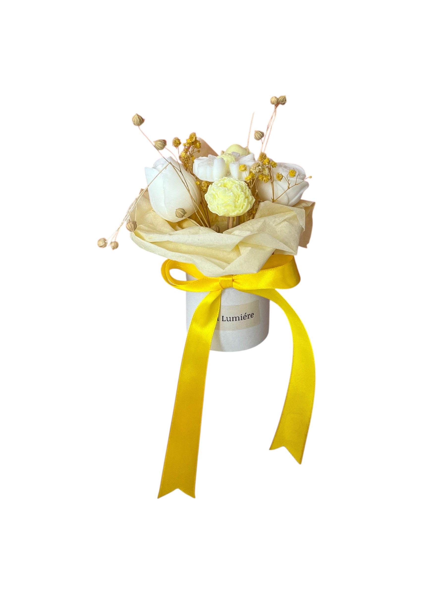 Χειροποίητο μικρό αρωματικό μπουκέτο από κερί σόγιας σε λευκές και κίτρινες αποχρώσεις, με αποξηραμένα λουλούδια. Σε κομψό κουτάκι, με άρωμα της επιλογής σας. Ιδανικό για μικρό δώρο ή διακριτική διακόσμηση.