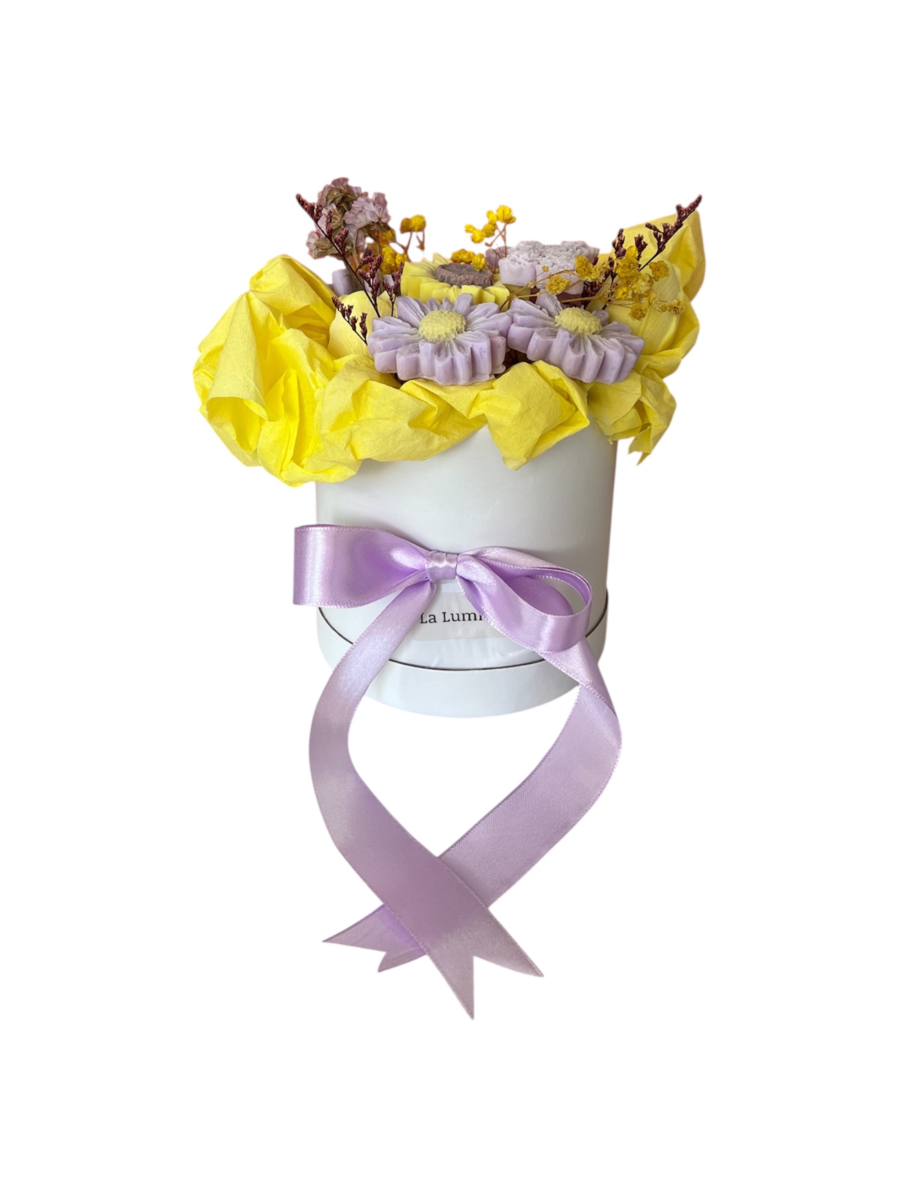 Κατασκευασμένο από 100% φυτικό κερί σόγιας, το κάθε λουλούδι είναι μοναδικό, σε κίτρινες και μωβ αποχρώσεις, και συνοδεύεται από φυσικά αποξηραμένα λουλούδια, προσδίδοντας φυσικότητα και φρεσκάδα στη σύνθεση. Επιλέγετε το άρωμα που σας ταιριάζει, για να το απολαύσετε όπως ακριβώς το θέλετε.