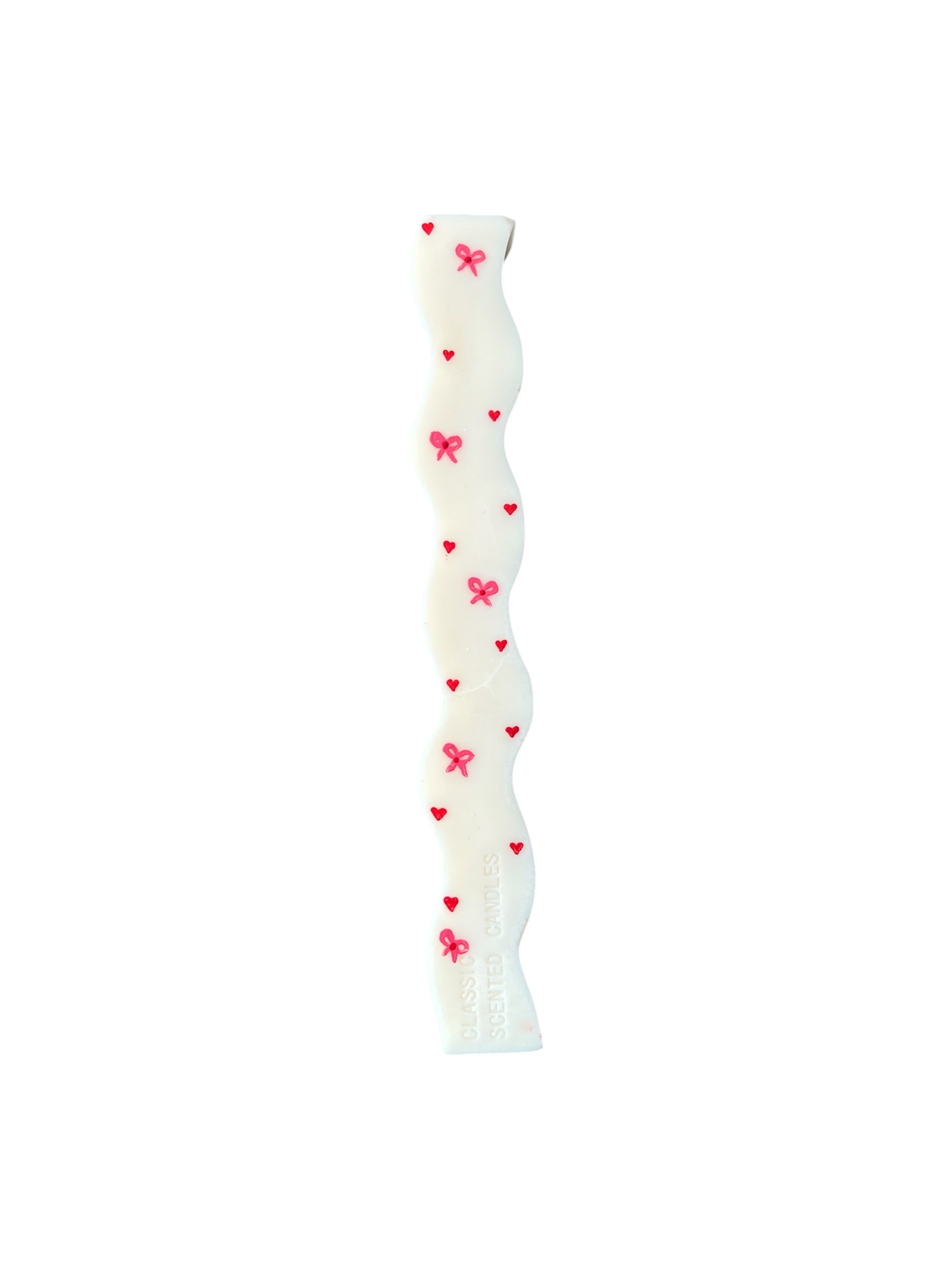 Χειροποίητη αρωματική κυματιστή λαμπάδα από φυτικό κερί σόγιας, ζωγραφισμένη στο χέρι, με ροζ φιογκάκια και κόκκινες καρδιές. Έχει ύψος 23 εκ. και ξεχωρίζει για το παιχνιδιάρικο και ρομαντικό σχέδιό της, ιδανική για την Ανάσταση ή ως ξεχωριστό πασχαλινό δώρο.