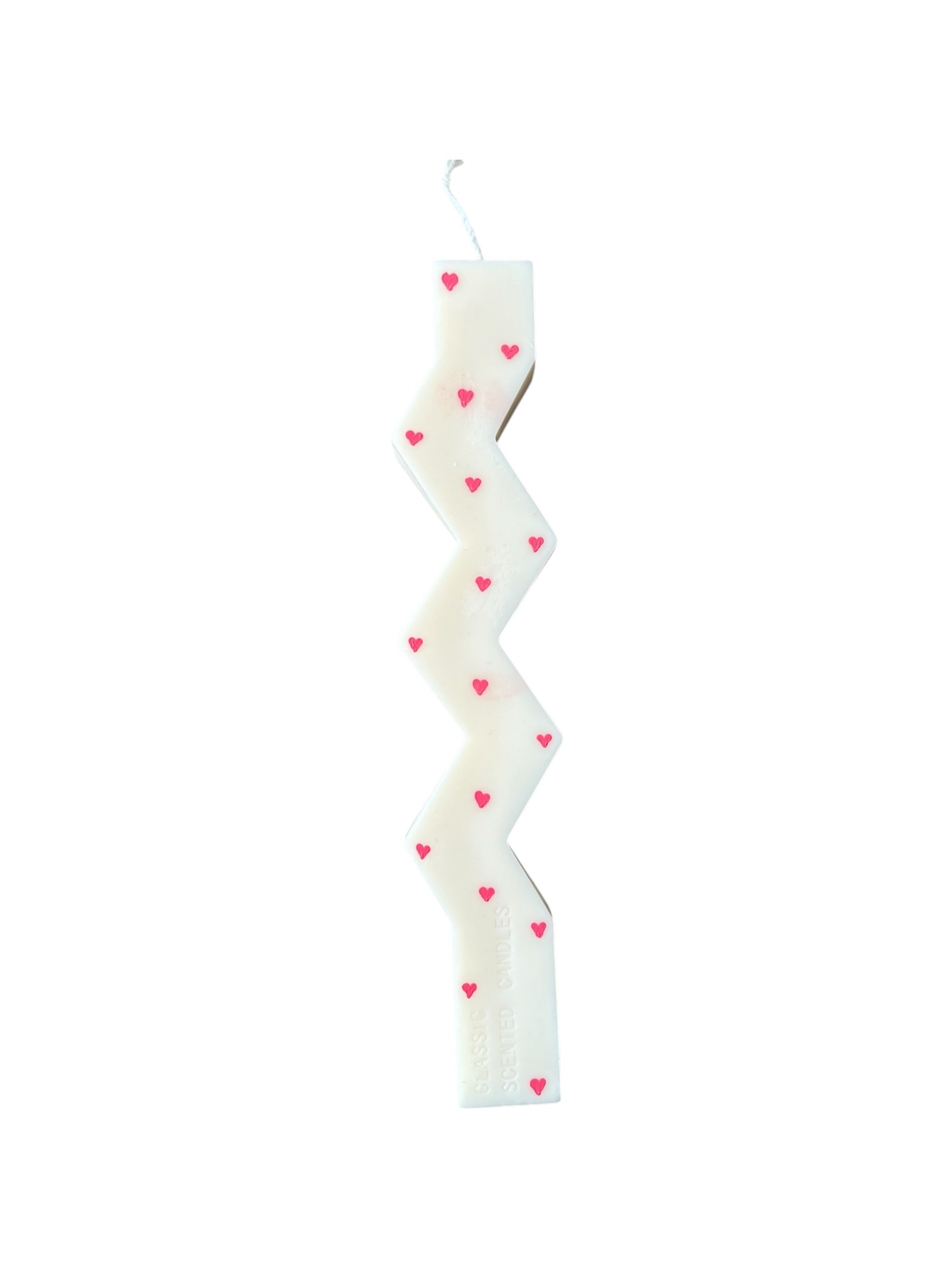 Χειροποίητη αρωματική ζικ-ζακ λαμπάδα από φυτικό κερί σόγιας, σε λευκή βάση με κόκκινες καρδιές, ζωγραφισμένη στο χέρι. Έχει ύψος 23 εκ. και ξεχωρίζει για το παιχνιδιάρικο και ρομαντικό σχέδιό της, ιδανική για την Ανάσταση ή για ένα ξεχωριστό πασχαλινό δώρο.
