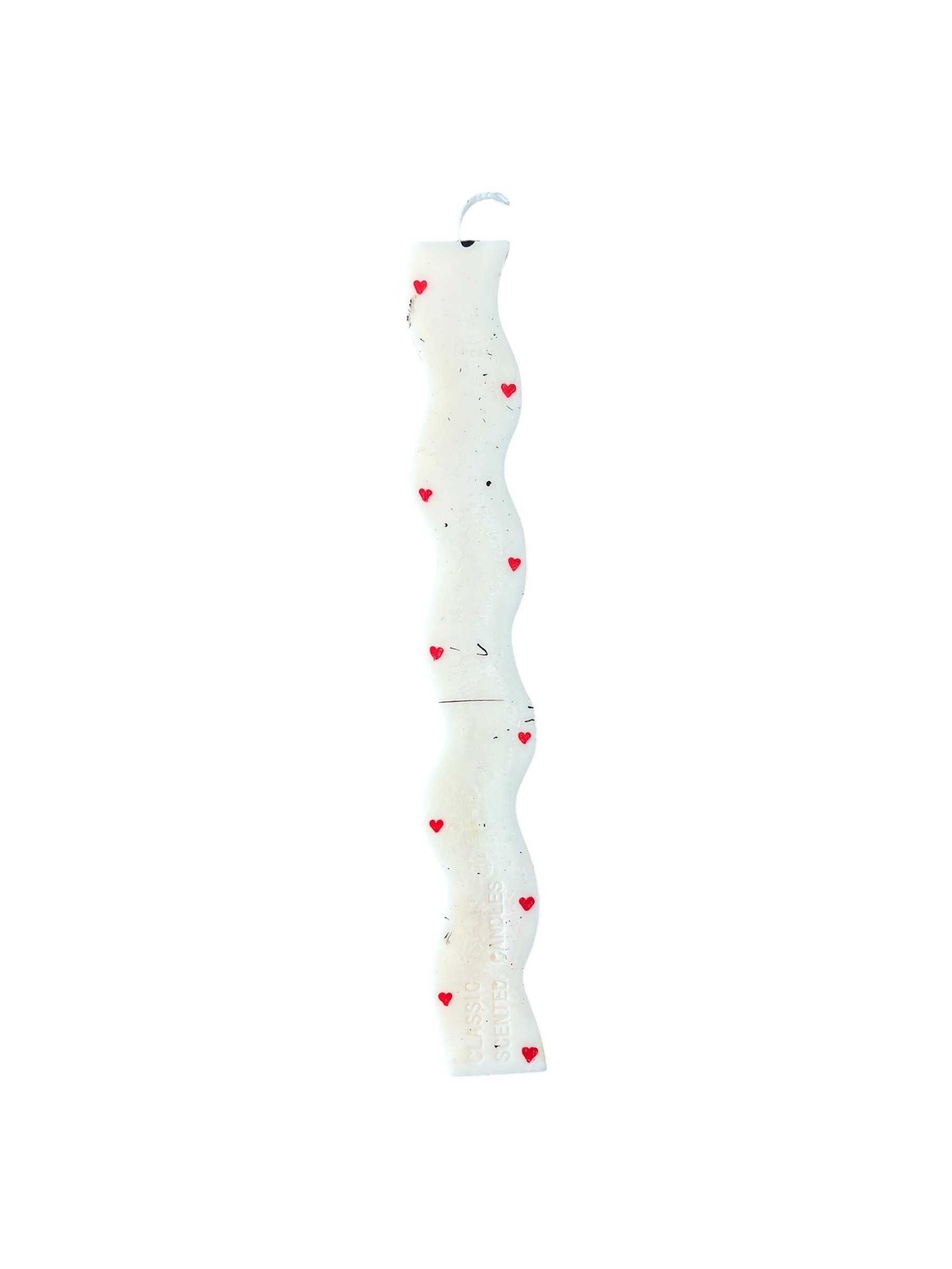 Χειροποίητη αρωματική κυματιστή λαμπάδα από φυτικό κερί σόγιας, σε λευκή βάση με μαύρες πιτσιλιές και κόκκινες καρδιές, ζωγραφισμένη στο χέρι. Έχει ύψος 23 εκ. και συνδυάζει μοντέρνο και παιχνιδιάρικο σχέδιο, ιδανική για την Ανάσταση ή για ένα ξεχωριστό πασχαλινό δώρο.
