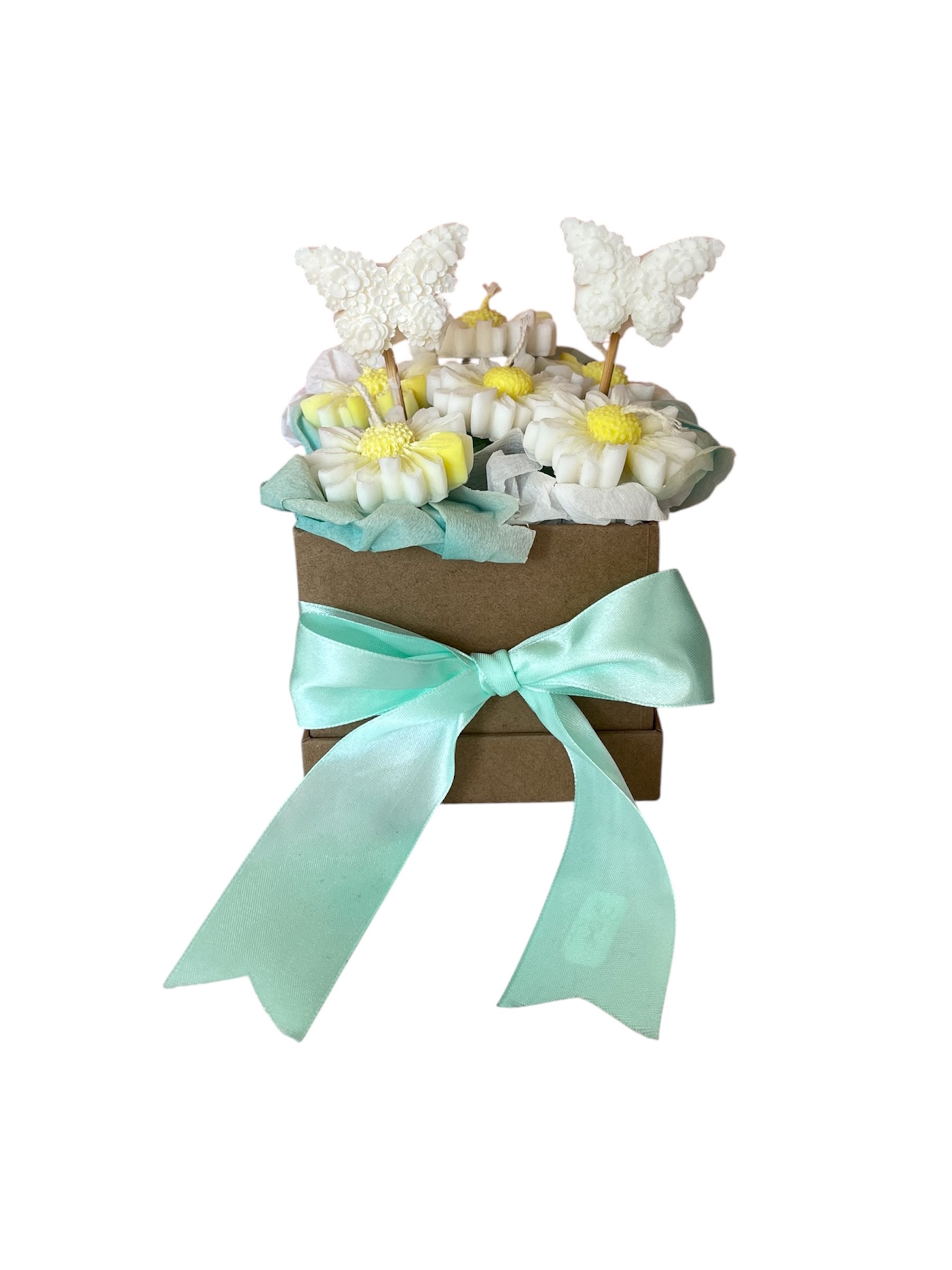 Χειροποίητο, μεγάλο, αρωματικό μπουκέτο λουλουδιών από 100% φυτικό κερί σόγιας, στο άρωμα της επιλογής σας. Σε καφέ τετράγωνο κουτί, με μαργαρίτες και πεταλούδες από κερί σε λευκό χρώμα. Ιδανικό για δώρο ή διακόσμηση.