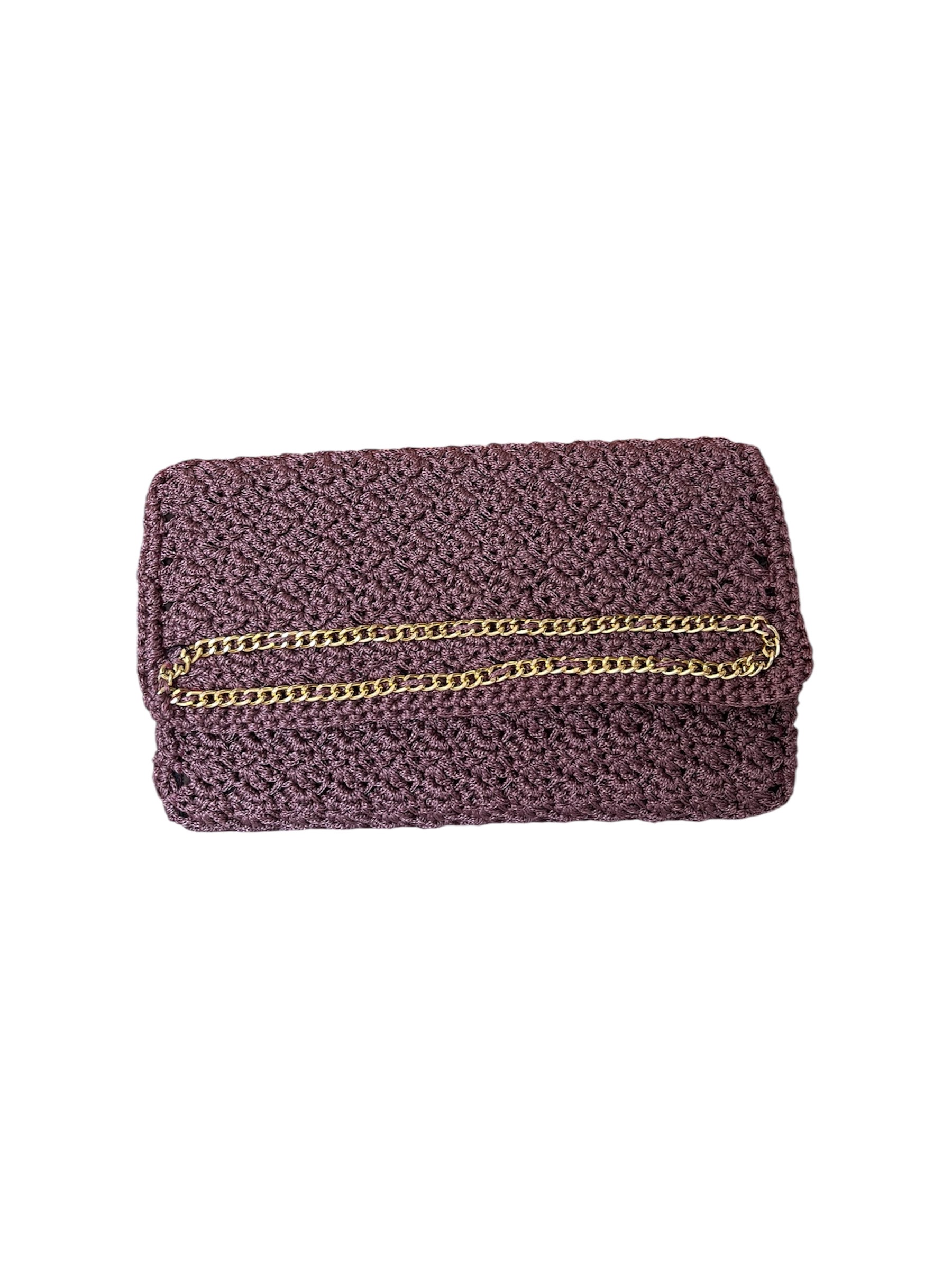 Χειροποίητη πλεκτή τσάντα-φάκελος με χρυσή αλυσίδα εξωτερικά και εσωτερική φόδρα, διαστάσεων περίπου 15×25 εκ. Ιδανική για ξεχωριστές εμφανίσεις με στυλ και φινέτσα.