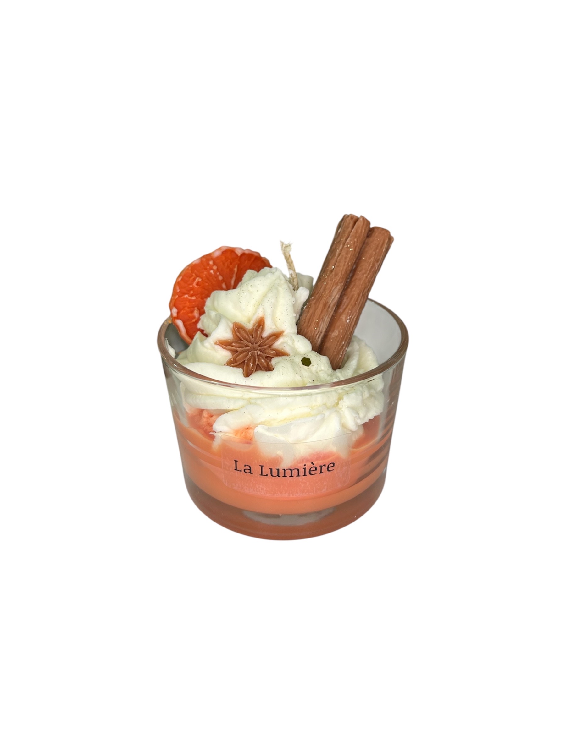 Η σύνθεσή του από 100% φυτικό κερί σόγιας, εξασφαλίζει καθαρή και μακράς διάρκειας καύση, χωρίς επιβλαβείς ουσίες, φιλική προς το περιβάλλον. Η ρεαλιστική του εμφάνιση με αφράτη «σαντιγί», πορτοκάλι και ξυλάκια κανέλας το κάνει ένα ιδανικό διακοσμητικό αλλά και μοναδικό δώρο.