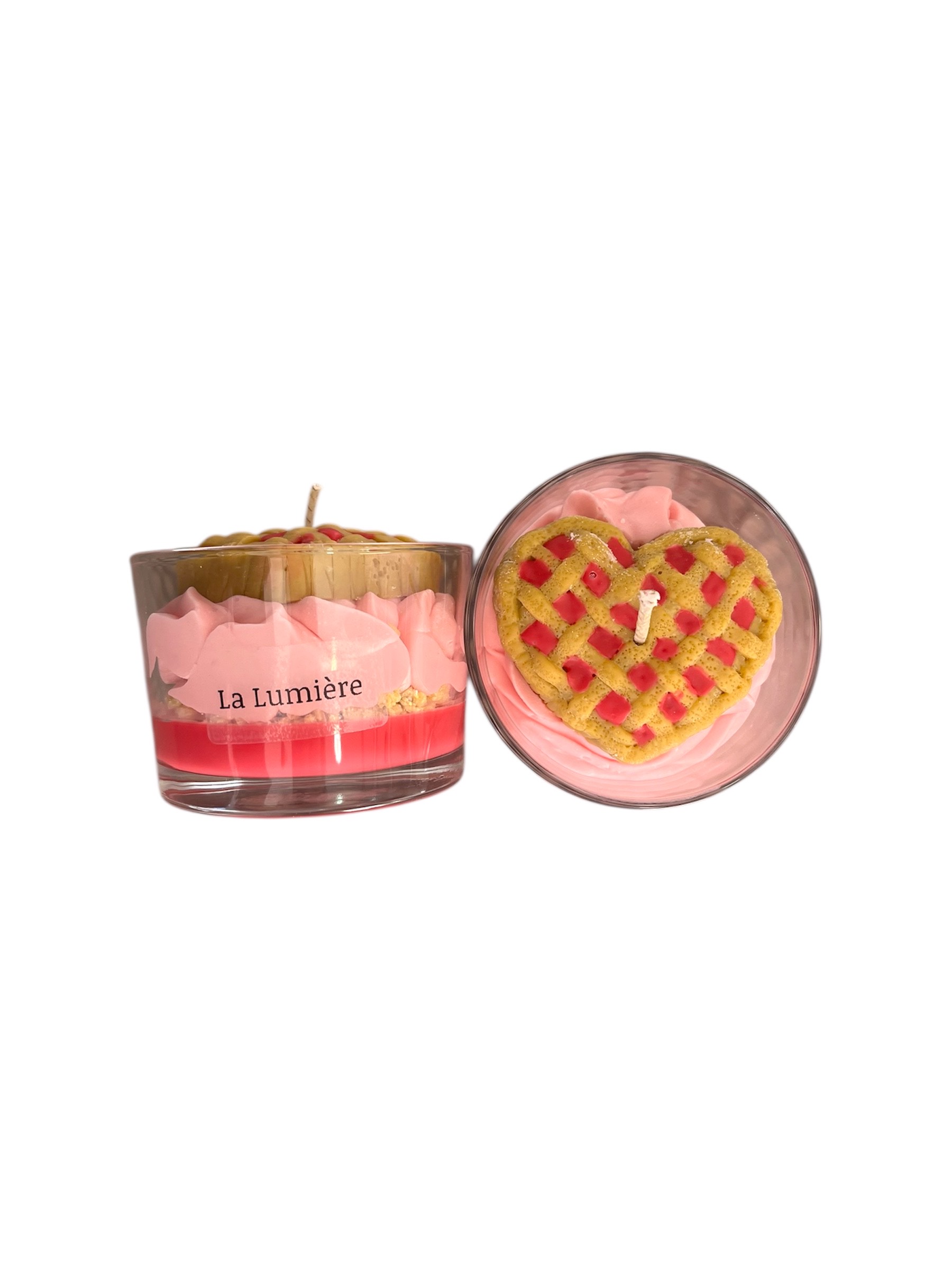 Φυτικό κερί σόγιας με γλυκό άρωμα κερασιού, εμπνευσμένο από την κλασική πάστα φλώρα. Με κόκκινη βάση, μπισκότο από κερί και ροζ σαντιγί από κερί, διακοσμημένο με πάστα φλώρα σε σχήμα καρδιάς. Διαθέτει πολλές ώρες καύσης.