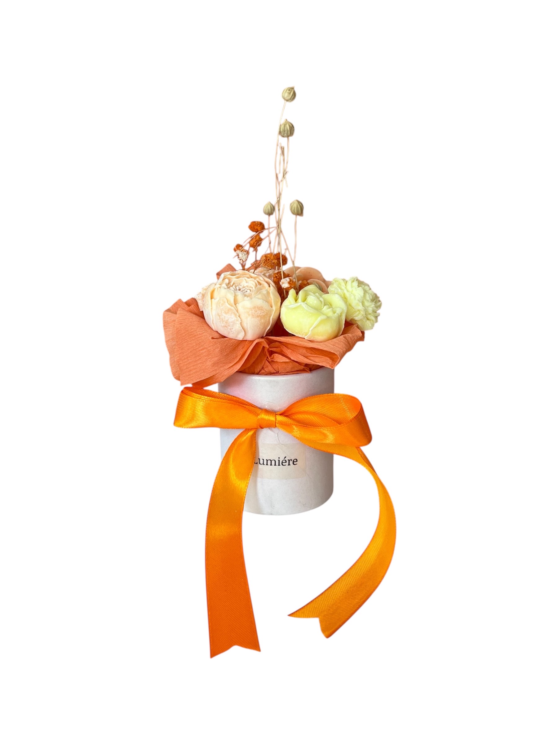Χειροποίητο μικρό αρωματικό μπουκέτο από κερί σόγιας σε πορτοκαλί και κίτρινες αποχρώσεις, με αποξηραμένα λουλούδια. Σε κομψό κουτάκι, με άρωμα της επιλογής σας. Ιδανικό για μικρό δώρο ή διακριτική διακόσμηση.