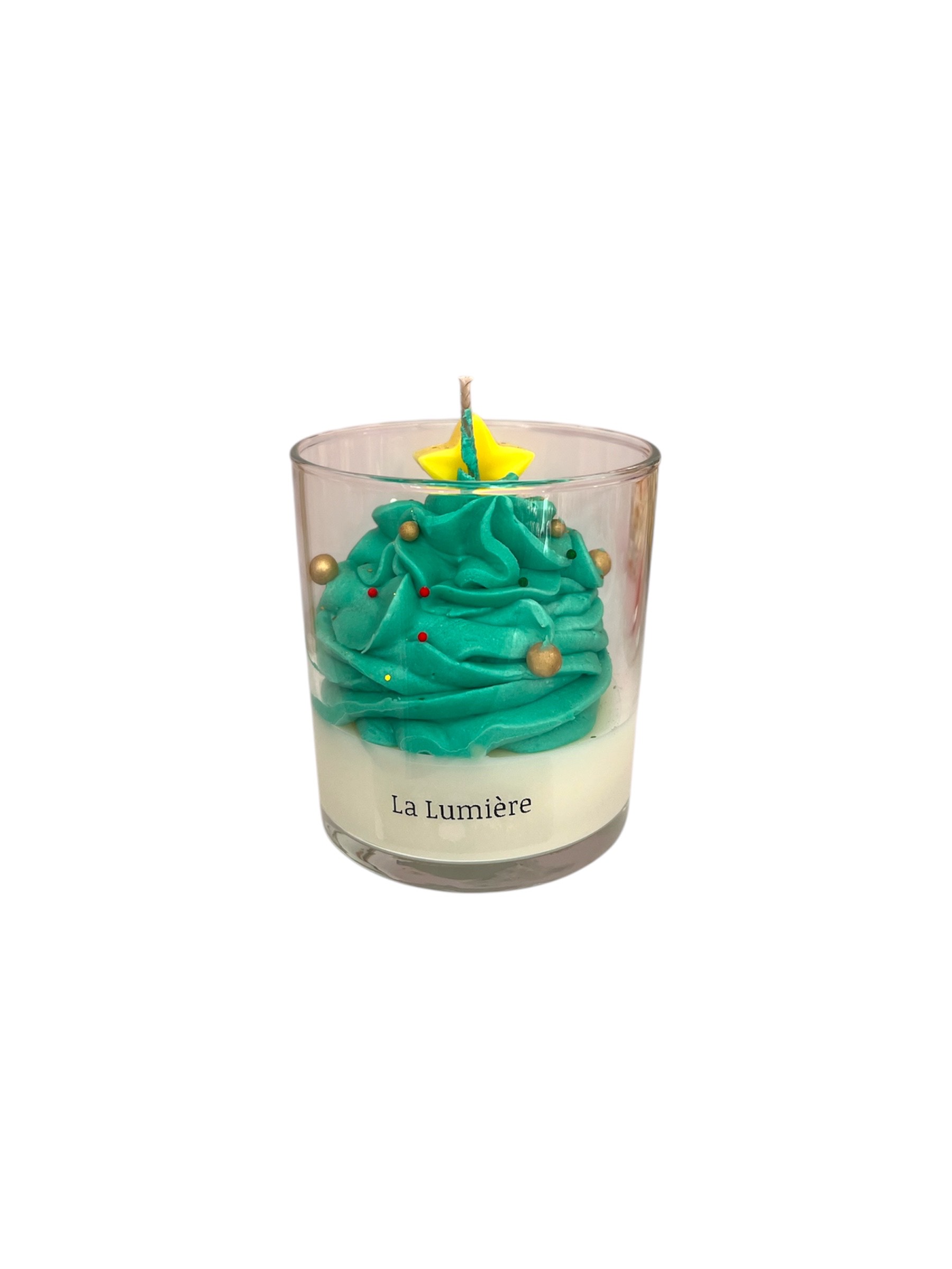 Χειροποίητο κερί σε ποτήρι με άρωμα φυστίκι καραμέλα. Λευκή βάση και διακόσμηση στην κορυφή με χριστουγεννιάτικο δέντρο από σαντιγί, στολισμένο με χρυσές και πολύχρωμες μπάλες και αστέρι.