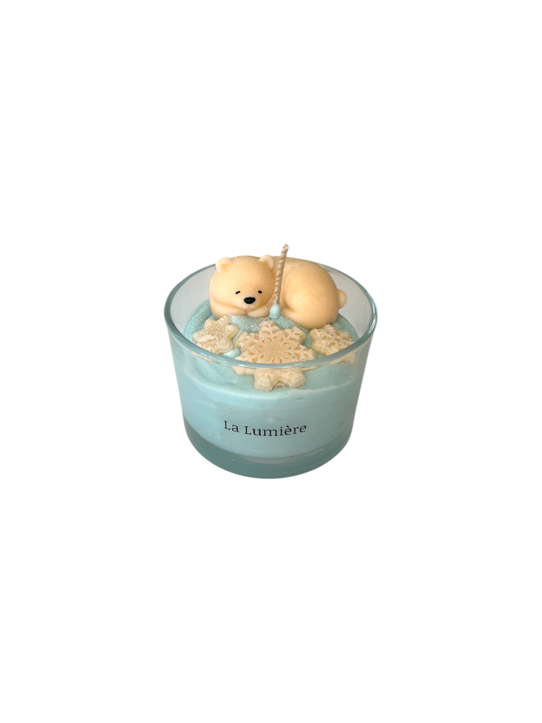 Η βάση του κεριού είναι διακοσμημένη με γαλάζια “σαντιγί” από κερί, ενώ επάνω έχουν τοποθετηθεί ένα χαριτωμένο αρκουδάκι και λεπτομέρειες χιονονιφάδων, δημιουργώντας μια τρισδιάστατη, παραμυθένια χειμερινή σκηνή. Το τελικό άγγιγμα; Άφθονο γκλίτερ που αντανακλά το φως και κάνει το κερί να λάμπει σαν παγωμένοι κρύσταλλοι.